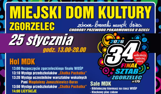 Już 25 stycznia Zgorzelec po raz kolejny zagra razem z Wielką Orkiestrą Świątecznej Pomocy. 34. Finał WOŚP, organizowany przez #175 Sztab WOŚP w Miejskim Domu Kultury w Zgorzelcu, odbędzie się w godzinach od 13:00 do 20:00 i zapowiada się jako prawdziwe święto muzyki, tańca i wspólnego pomagania. W programie nie zabraknie wyjątkowych atrakcji m.in. Koncertu Kolęd Zgorzeleckiej Orkiestry Mandolinistów, okazji do podziwiania panoramy miasta z wieży ciśnień PWiK oraz licznych wydarzeń przygotowanych przez Miejską Bibliotekę Publiczną.