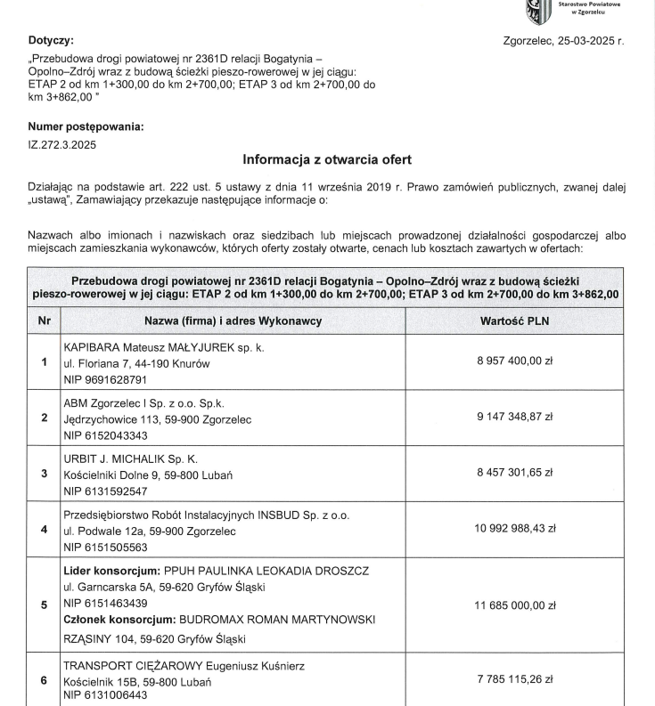 Starostwo Powiatowe w Zgorzelcu 10 marca ogłosiło przetarg „Przebudowa drogi powiatowej nr 2361D relacji Bogatynia – Opolno–Zdrój wraz z budową ścieżki pieszo-rowerowej w jej ciągu: ETAP 2 od km 1+300,00 do km 2+700,00; ETAP 3 od km 2+700,00 do km 3+862,00”. Pisaliśmy o tym TUTAJ