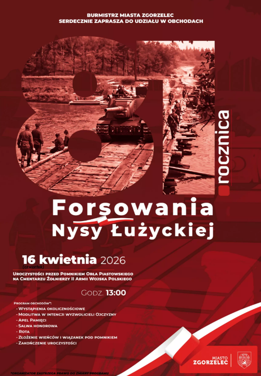 16 kwietnia 2026 roku o godz. 13:00 na Cmentarzu Żołnierzy II Armii Wojska Polskiego odbędą się coroczne obchody rocznicy forsowania Nysy Łużyckiej – wydarzenia o szczególnym znaczeniu patriotycznym i historycznym.