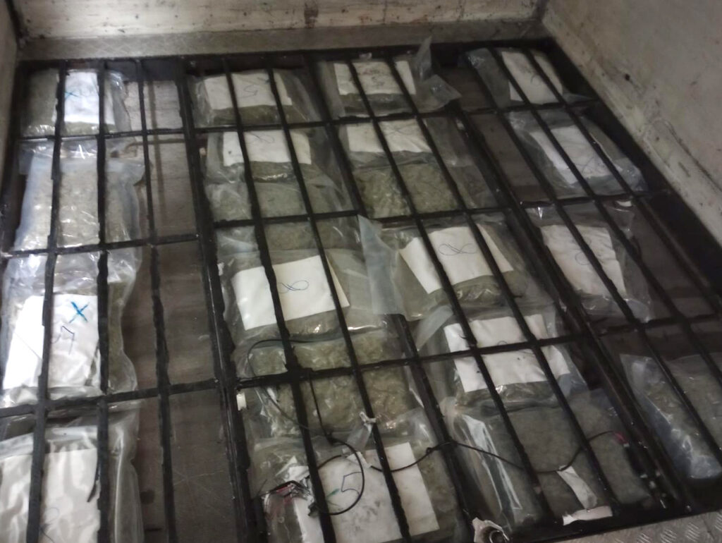 W trakcie przeszukania wykryto specjalnie skonstruowaną skrytkę w podłodze przewożonego samochodu, w której znajdowało się prawie 22 kg marihuany. Dodatkowo, w przyczepie kempingowej funkcjonariusze znaleźli: