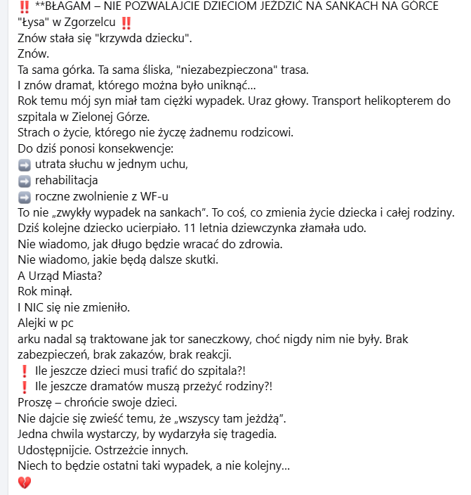 Apel rodzica: BŁAGAM – NIE POZWALAJCIE DZIECIOM JEŹDZIĆ NA SANKACH NA GÓRCE „Łysa” w Zgorzelcu
