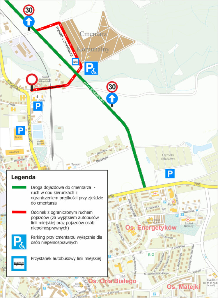 Jednocześnie informujemy, że z parkingu zlokalizowanego bezpośrednio przy Cmentarzu Komunalnym korzystać będą mogły jedynie osoby niepełnosprawne (posiadające kartę parkingową) oraz osoby w podeszłym wieku.