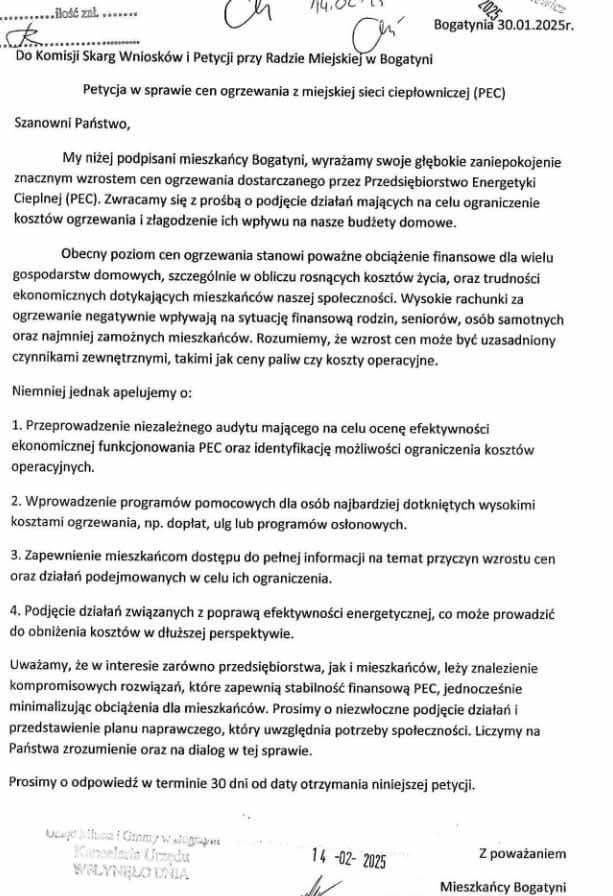 Telewizja Bogatynia poinformowała dziś na swoim profilu w social mediach o petycji, którą wystosowali mieszkańcy miasta do Komisji Skarg Wniosków i Petycji przy Radzie Miejskiej w Bogatyni. W dokumencie wskazują na znaczny wzrost cen ogrzewania dostarczanego przez PEC (Przedsiębiorstwo Energetyki Cieplnej), co stanowi poważne obciążenie finansowe dla wielu gospodarstw domowych. Apelują m.in. o przeprowadzenie niezależnego audytu działania PEC i wprowadzenie programów pomocowych dla grup mieszkańców.