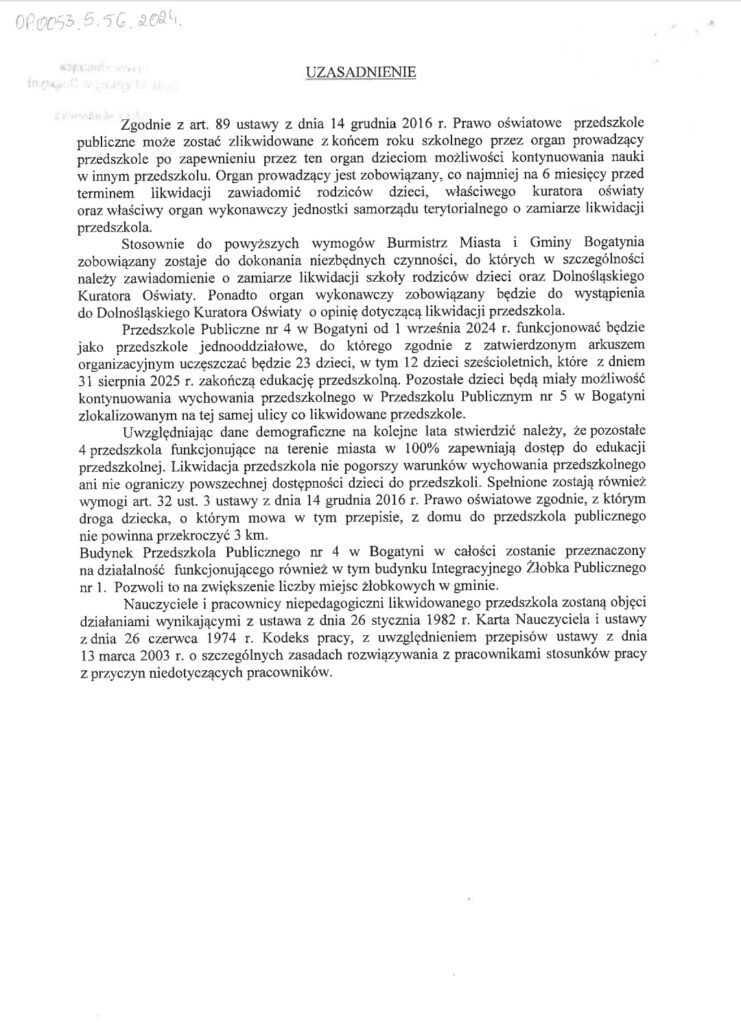 W uzasadnieniu uchwały czytamy, że Przedszkole Publiczne nr 4 od 1 września tego roku funkcjonować będzie jako przedszkole jednooddziałowe, do którego zgodnie z arkuszem organizacyjnym uczęszczać będzie 23 dzieci, w tym 12 dzieci sześcioletnich, które z dniem 31 sierpnia 2025 r. zakończą edukację przedszkolną. Pozostałe dzieci będą miały możliwość kontynuowania wychowania przedszkolnego w Przedszkolu Publicznym nr 5, które znajduje się przy tej samej ulicy, co likwidowane przedszkole (ul. Chopina 13).