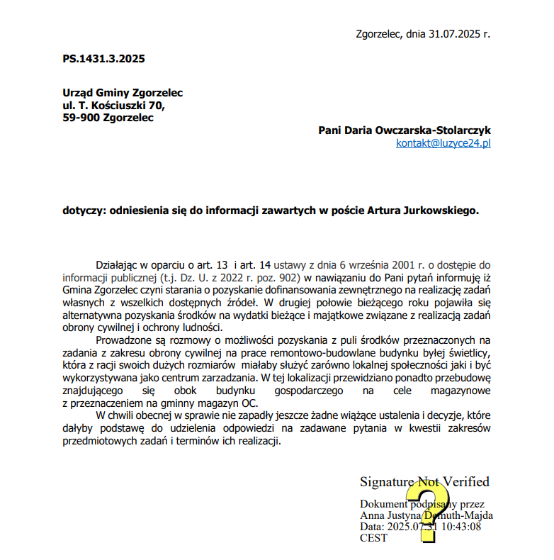 Z Zastępcą Wójta Gminy Zgorzelec Pawłem Tomczykiem rozmawialiśmy o remoncie budynku po byłej świetlicy w Jędrzychowicach na potrzeby budowli ochronnych.