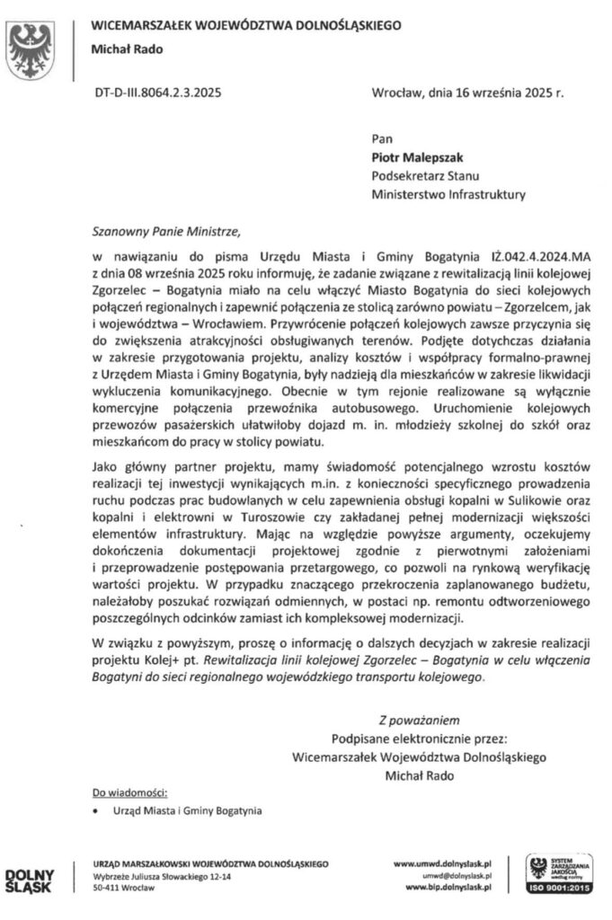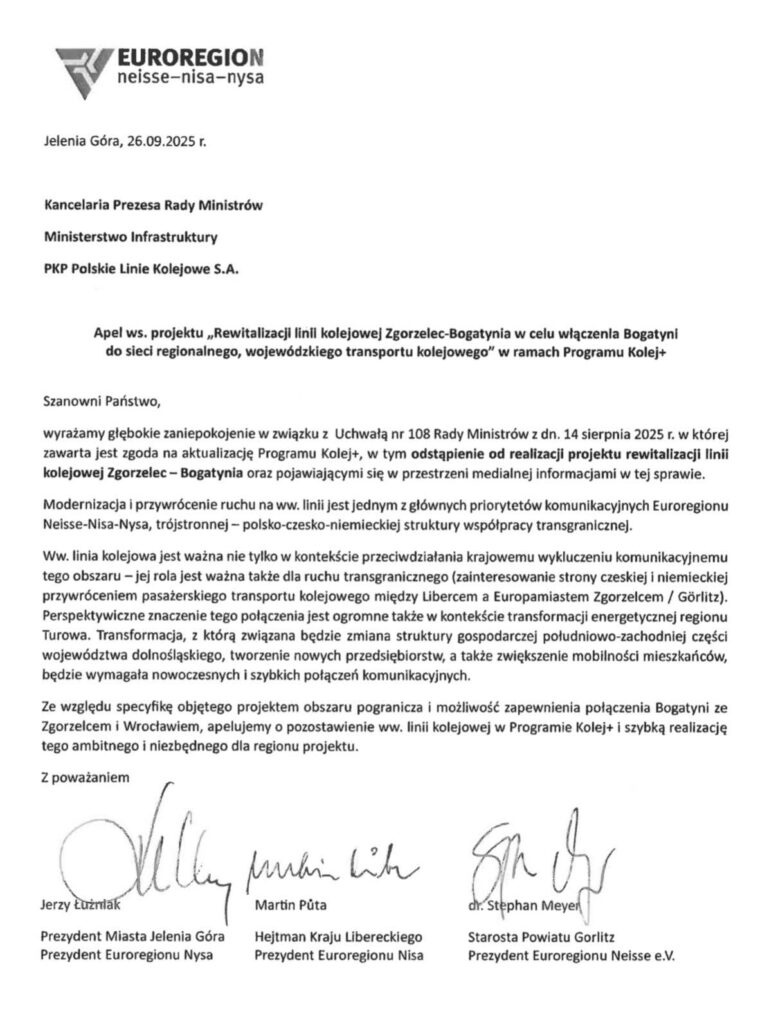 „Z ogromnym niepokojem przyjąłem informację o rekomendacji odstąpienia od rewitalizacji linii kolejowej Zgorzelec–Bogatynia, zawartej w sprawozdaniu Ministerstwa Infrastruktury, przyjętym przez Radę Ministrów 14 sierpnia 2025 r.