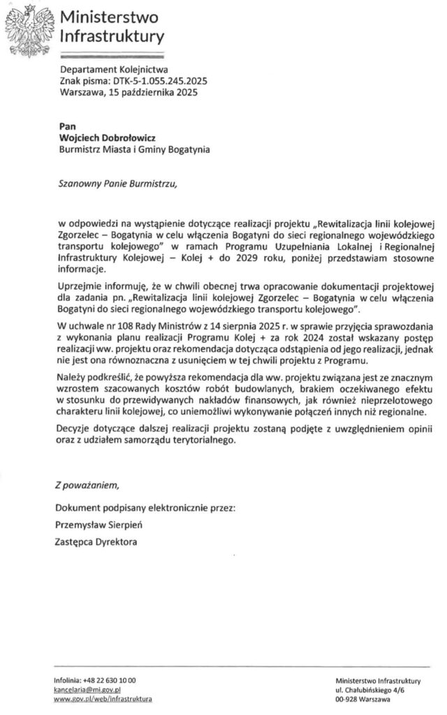 Burmistrz Bogatyni Wojciech Dobrołowicz, wyraził sprzeciw wobec rekomendacji Ministerstwa Infrastruktury dotyczącej rezygnacji z rewitalizacji linii kolejowej Zgorzelec–Bogatynia. Podkreślił, że projekt ten jest kluczowy dla walki z wykluczeniem komunikacyjnym Bogatyni i ma duże znaczenie społeczne oraz gospodarcze dla regionu.