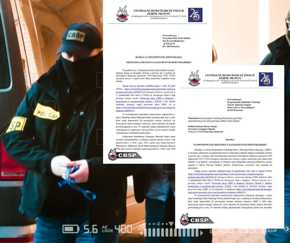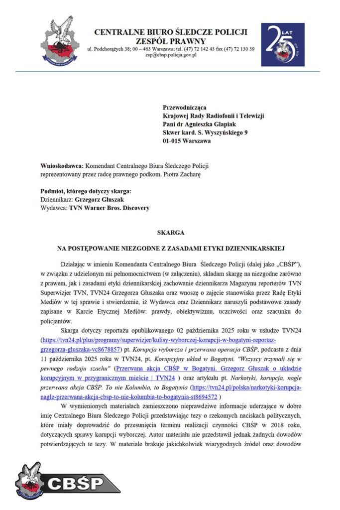 W dniu 02 października 2025 r. oraz 11 października 2025 r. na platformie internetowej w TVN24 i na portalach internetowych Grupy Warner Bros Discovery Poland opublikowano materiały prasowe w postaci reportażu Grzegorza Głuszaka pt. „Korupcja wyborcza i przerwana operacja CBŚP”, pt. „Korupcyjny układ w Bogatyni. Wszyscy trzymali się w pewnego rodzaju szachu” oraz pt. „Narkotyki, korupcja, nagle przerwana akcja CBŚP. To nie Kolumbia, to Bogatynia”. Poszczególne tytuły wskazują na powiązania korupcyjne Centralnego Biura Śledczego Policji z władzami samorządowymi w Bogatyni. Materiał jest nieprawdziwy i nieetyczny, a autor Grzegorz Głuszak nie zadał sobie trudu rzetelnego ustalenia stanu faktycznego, łącząc w jeden temat kilka niezwiązanych ze sobą informacji w celu osiągnięcia swojego partykularnego interesu, kosztem naruszenia dobrego imienia CBŚP i dóbr osobistych służących w nim policjantów, narażając ich po emisji materiału na ostracyzm i negatywny odbiór opinii publicznej.