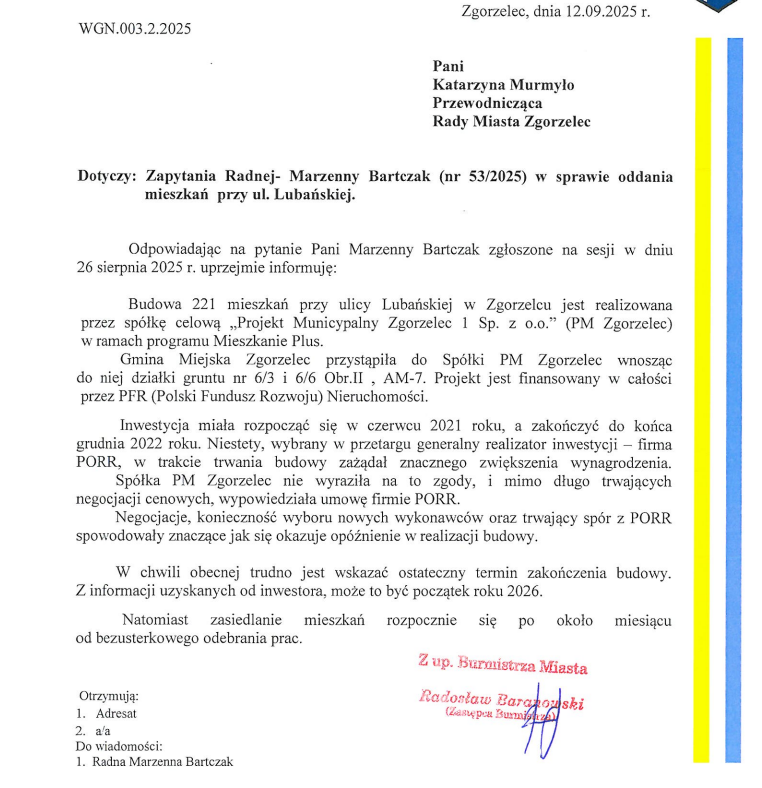 „W odpowiedzi na zapytanie pani radnej Marzeny Bartczak informuję, że planowany termin oddania do użytku budynku w Zgorzelcu przy ulicy Pogodnej planowany jest na przełom 2026/2027 r”.