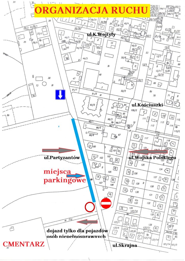 – zakazu ruchu na ul. Cmentarną z wyłączeniem oznakowania pojazdów dla osób niepełnosprawnych.