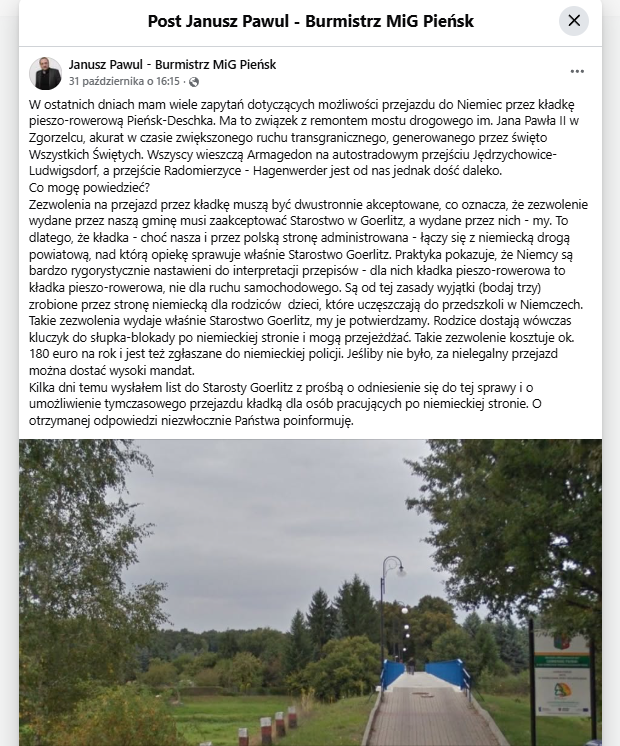 „Praktyka pokazuje, że Niemcy są bardzo rygorystycznie nastawieni do interpretacji przepisów – dla nich kładka pieszo-rowerowa to kładka pieszo-rowerowa, nie dla ruchu samochodowego” – pisze Janusz Pawul w mediach społecznościowych.