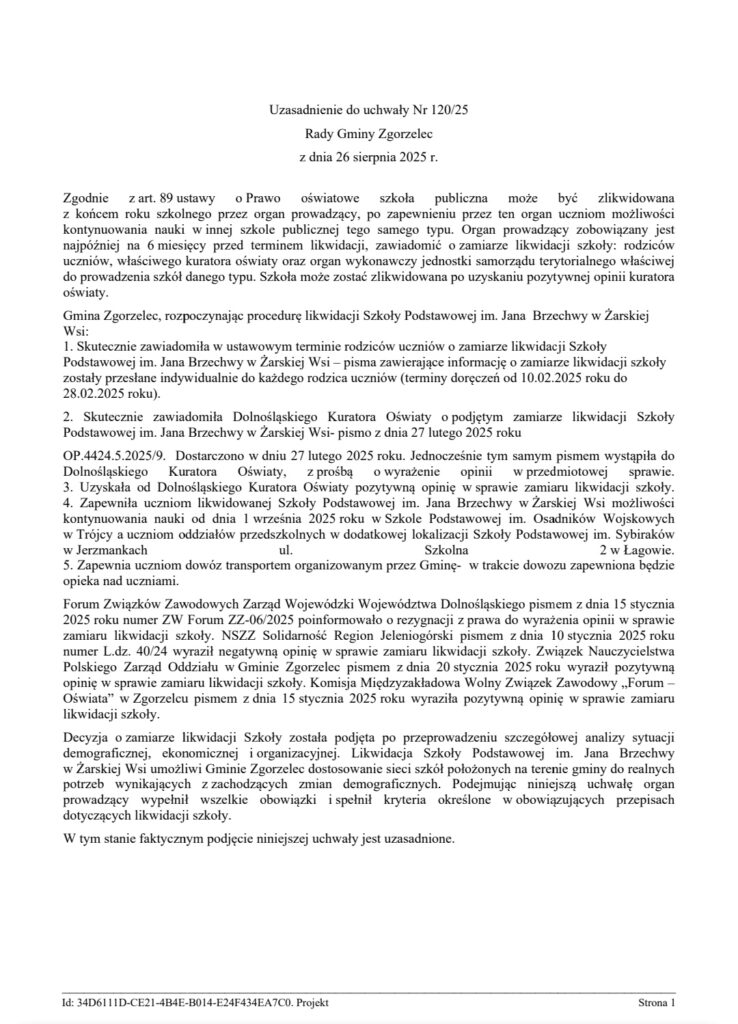 „Decyzja o zamiarze likwidacji Szkoły została podjęta po przeprowadzeniu szczegółowej analizy sytuacji demograficznej, ekonomicznej i organizacyjnej. Likwidacja Szkoły Podstawowej im. Jana Brzechwy w Żarskiej Wsi umożliwi Gminie Zgorzelec dostosowanie sieci szkół położonych na terenie gminy do realnych potrzeb wynikających z zachodzących zmian demograficznych. Podejmując niniejszą uchwałę organ prowadzący wypełnił wszelkie obowiązki i spełnił kryteria określone w obowiązujących przepisach dotyczących likwidacji szkoły”.