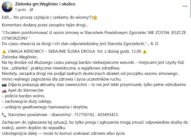 Sprawę nagłośnił fanpage Zielonka gm. Węgliniec i okolice. Co najbardziej zatrważające w tej sprawie – pośród licznych komentarzy pojawił się także komentarz firmy, która na zlecenie powiatu zgorzeleckiego (po wygraniu przetargu) ma odpowiadać za utrzymanie tej drogi. Z jego treści dowiadujemy się, że niestety, jeśli pogoda się nie poprawi i sytuacja nie rozwiąże się sama, to nic się nie zmieni, ponieważ – UWAGA – Starostwo Powiatowe w Zgorzelcu nie otworzyło jeszcze sezonu zimowego 2025/2026!