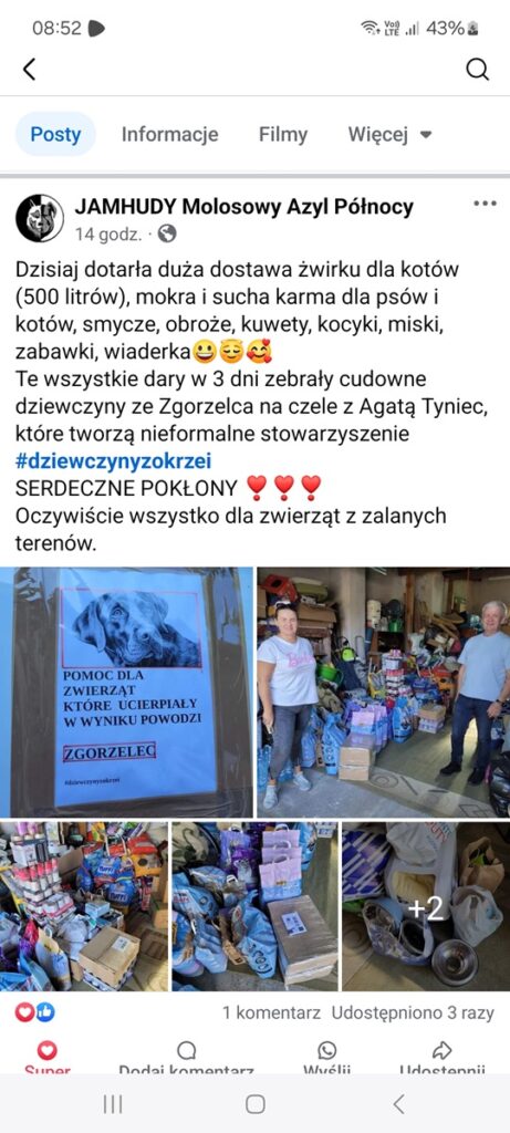 Nasza pomoc rozpoczęła się praktycznie wraz z początkiem wojny w Ukrainie. 28 lutego 2022 r. otworzyłyśmy pierwszy w Zgorzelcu punkt pomocy przy ulicy Okrzei, który zapełniał się darami, wielką empatią i życzliwością oraz ogromnym wsparciem dla wszystkich, których wojna zmusiła do opuszczenia swoich domów. Były transporty do szpitali dla żołnierzy, ludności cywilnej i schronisk dla zwierząt, była też pomoc naszych wolontariuszy na dworcu PKP, kiedy przyjeżdżały pociągi z przerażonymi i zagubionymi ludźmi, którzy ruszali w nieznany im świat. To już 3 lata od agresji Rosji na Ukrainę, wojna zmusiła miliony ludzi do ucieczki, opuszczenia swoich rodzinnych domów, codziennie giną niewinni ludzie, a okupant niszczy dorobek kulturalny i cywilizacyjny Ukrainy. A my- #dziewczynyzokrzei nadal pomagamy wysyłając transporty z pomocą humanitarną na Ukrainę i to dzięki: Powiatowemu Centrum Zarządzania Kryzysowego , Starostwu Powiatowemu, Urzędowi Miasta Zgorzelec, Powiatowej Straży Pożarnej w Zgorzelcu, firmie dr Schumacher Lubań/Polska, Zklaster Zgorzelec, Cerkwi Prawosławnej w Zgorzelcu, MDK w Zgorzelcu, Caritas Zawidów, Hipermarketowi Carrefour, Dyskontowi Lidl Zgorzelec, Uniwersytetowi III Wieku, Metingpoint Memory Messiaen e.V oraz mieszkańcom powiatu zgorzeleckiego. Jesteśmy niewielką grupą, która przez ponad 3 lata potrafiła zaangażować w działalność społeczną nie tylko mieszkańców naszego miasta ale również z okolicy. Działamy bez dotacji finansowych, bo taka była nasza decyzja, żeby być grupą nieformalną. Wszystkie nasze działania są udokumentowane, czy to dotyczy koncertów, zbiórek, akcji charytatywnych, czy wysyłanych transportów na Ukrainę. Każda paczka wysłana na Ukrainę, czy przekazana w Polsce, to promocja Zgorzelca i ludzi, którzy nam pomagają oraz forma podziękowania tym, dzięki którym to się udało. Jako #dziewczynyzokrzei otrzymujemy podziękowania z Ukrainy, Polski i to jest dla nas motywacja do dalszej pracy. Świadczy to o naszej wiarygodności, a każda przeprowadzona akcja spotyka się z dużym odzewem: zbiórka podpisów pod petycją w obronie zwierząt, pomoc schroniskom, które ucierpiały w trakcie wrześniowej powodzi czy paczki świąteczne dla Lądka Zdrój no i oczywiście pomoc humanitarna na Ukrainę. To są tylko działania za rok 2024. Robimy to, bo taka jest potrzeba chwili, a jednocześnie pokazujemy, że wystarczy impuls, a dzieją się rzeczy wielkie.