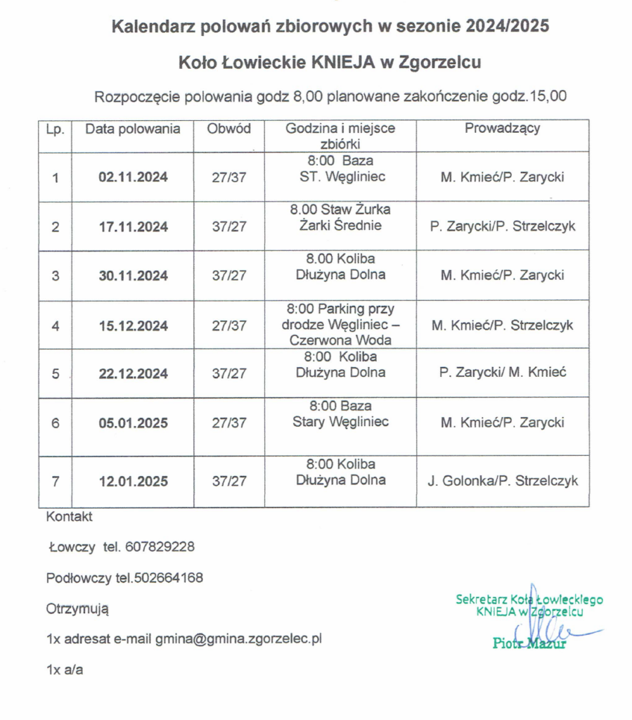 Urząd Gminy Zgorzelec opublikował kalendarz polowań zbiorowych w sezonie 2024/2025 w lasach na terenie gminy. Każde z polowań rozpoczynać się będzie o godzinie 8:00, a kończyć o godzinie 15:00. Zachowajcie ostrożność!