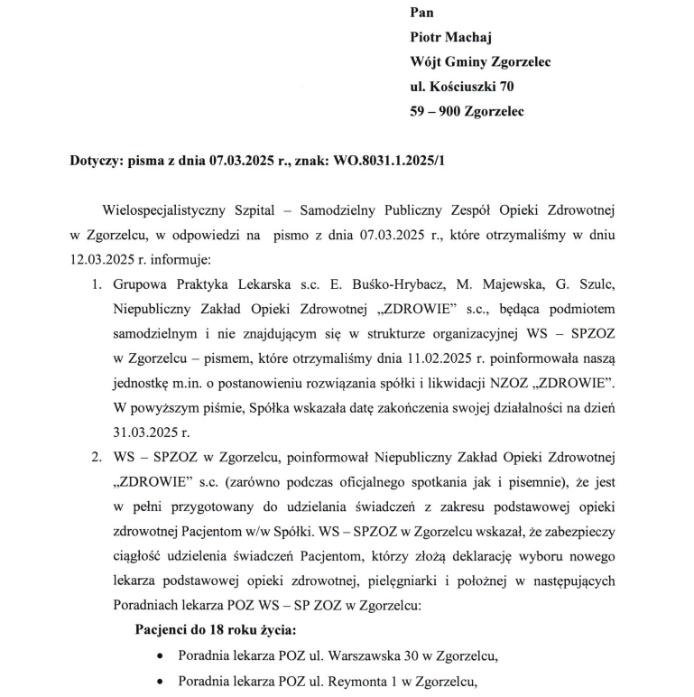 W związku z prośbą Przewodniczącej Rady Gminy Anny Rakoczy o skierowanie do Dyrektora Wielospecjalistycznego Szpitala SPZOZ w Zgorzelcu pytań odnośnie likwidacji przychodni „Zdrowie” w Zgorzelcu, Wójt Gminy wystosował pismo z prośbą o wyjaśnienie wątpliwości mieszkańców gminy zapisanych do w/w placówki. Poniżej odpowiedź jaka wpłynęła do Urzędu.