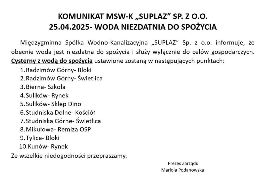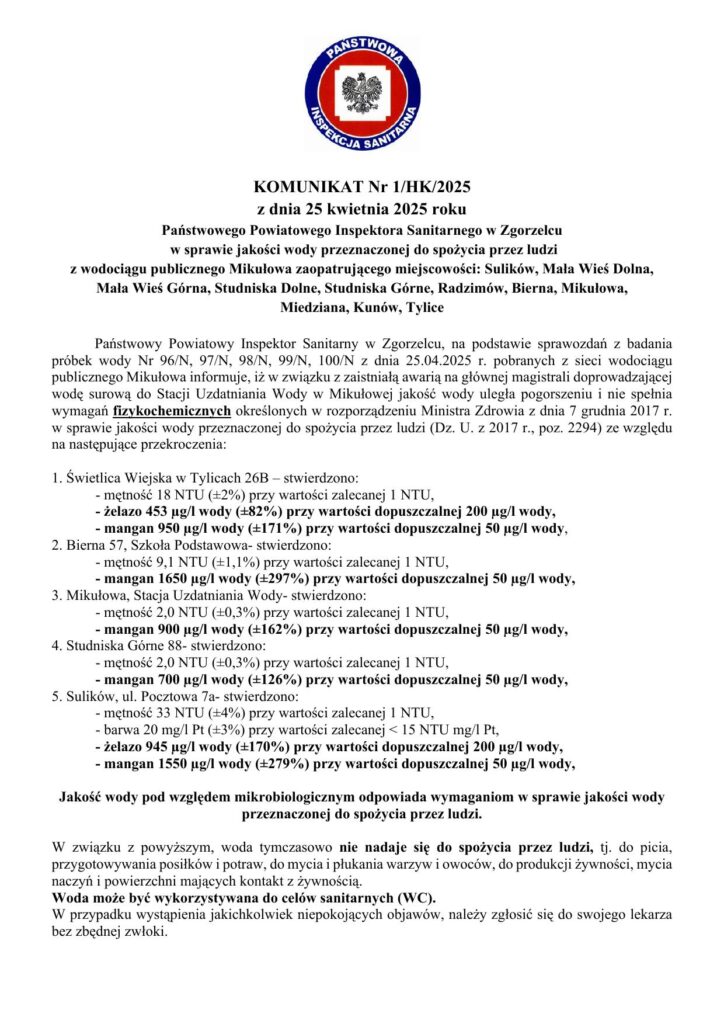 Tagi: Sanepidsulikówwoda niezdatna do piciawodociąg mikułowa