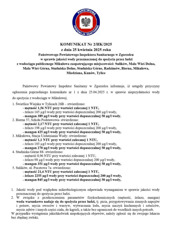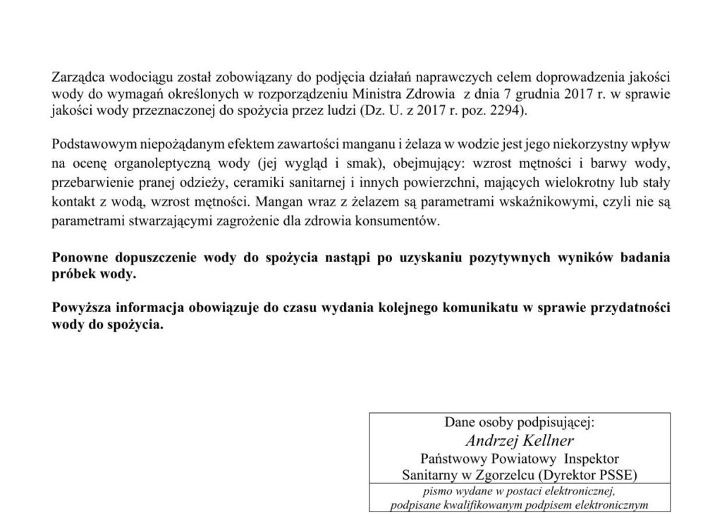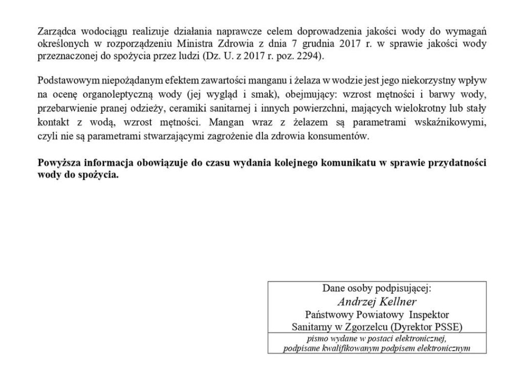 Państwowy Powiatowy Inspektor Sanitarny w Zgorzelcu opublikuje kolejny komunikat dotyczący spełnienia wymagań rozporządzenia Ministra Zdrowia z dnia 7 grudnia 2017 r. w sprawie jakości wody przeznaczonej do spożycia przez ludzi (Dz. U. z 2017 r. poz.2294) po przedłożeniu przez zarządcę wodociągu kolejnych wyników badania próbek wody.