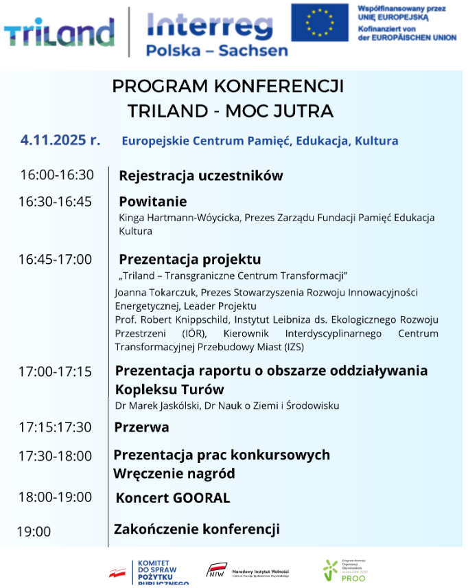 W programie konferencji przewidziano m.in. prezentację projektu „TRILAND – Transgraniczne Centrum Transformacji”, omówienie raportu o obszarze oddziaływania Kompleksu Turów, wręczenie nagród konkursowych dla dzieci i młodzieży oraz koncert Goorala.
