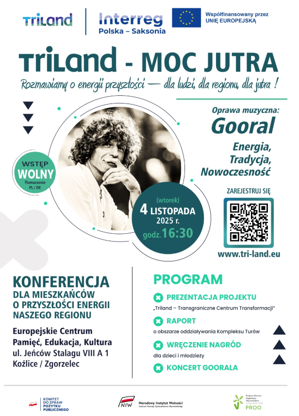 W dniu 4 listopada 2025 roku o godz. 16:30 w siedzibie Europejskiego Centrum Pamięć, Edukacja, Kultura przy ul. Jeńców Stalagu VIII A 1 w Zgorzelcu (Koźlice) odbędzie się konferencja „TRILAND – MOC JUTRA”. Wydarzenie realizowane jest w ramach projektu „TRILAND – Transgraniczne Centrum Transformacji”, współfinansowanego ze środków Unii Europejskiej w programie Interreg Polska–Saksonia 2021–2027.