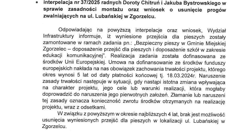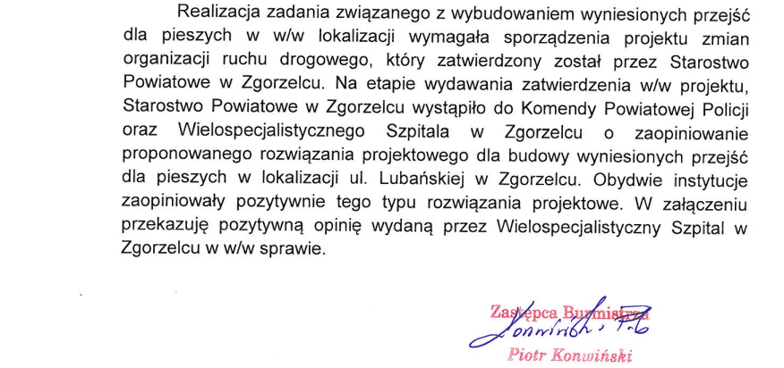 Interpelację w sprawie likwidacji wyniesionych przejść dla pieszych przy ul. Lubańskiej złożyli Radni Rady Miejskiej w Zgorzelcu — Dorota Chitruń i Jakub Bystrowski. W piśmie skierowanym do burmistrza Rafała Gronicza powoływali się na Rozporządzenie Ministra Infrastruktury dotyczącego stosowania progów zwalniających w sąsiedztwie szpitali. Zamiast „hopek” proponowali inne możliwe rozwiązania, które będą bezpieczniejsze i mniej uciążliwe dla ruchu karetek pogotowia.