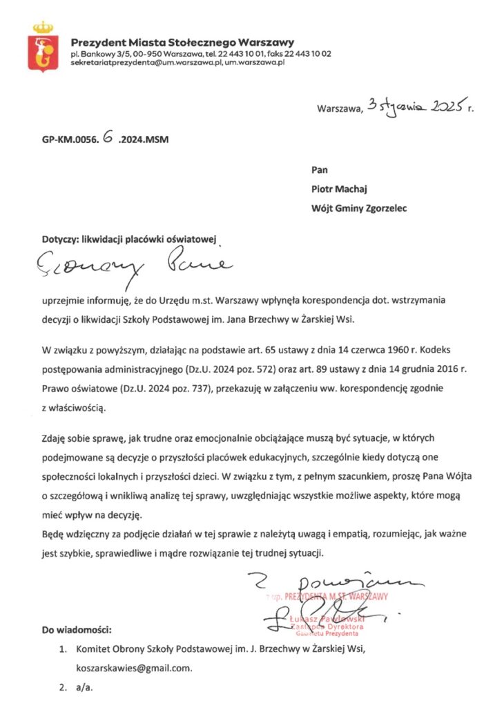 Likwidacja szkoły w Żarskiej Wsi – oficjalny list do Wójta od Prezydenta Warszawy