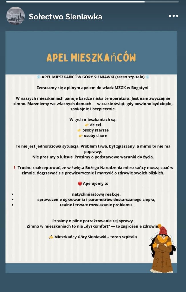 Mieszkańcy części Sieniawki, w rejonie szpitala, marzną w święta we własnych domach. Kaloryfery są zimne, a temperatury w pomieszczeniach spadły do alarmująco niskiego poziomu — w niektórych mieszkaniach spadły nawet do zaledwie 15 stopni Celsjusza. Sytuacja jest wyjątkowo niepokojąca, ponieważ na zewnątrz panuje mróz, a prognozy zapowiadają dalsze ochłodzenie.
