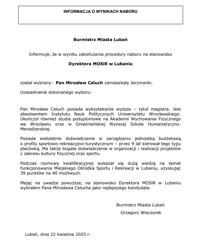 „Podczas rozmowy kwalifikacyjnej wykazał się dużą wiedzą na temat funkcjonowania Miejskiego Ośrodka Sportu i Rekreacji w Lubaniu, uzyskując 39 punktów na 40 możliwych” – pisze w uzasadnieniu Grzegorz Wieczorek, Burmistrz Miasta Lubań. Poniżej pełna treść: