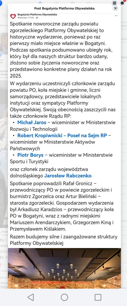Nie zabrakło figur z rządu — Michała Jarosa, Roberta Kropiwnickiego i Piotra Borysa. Nie zaskoczyła obecność Krystyny Radzięty — Sołtys Jędrzychowic i Dyrektor Miejskiej Biblioteki Publicznej w Zgorzelcu, od lat związanej z PO. W kuluarach mówiło się, że to właśnie ona będzie przyszłą kandydatką na Wójta Gminy Zgorzelec z ramienia Platformy, kiedy ze stanowiska odejdzie Piotr Machaj. Jednak na spotkaniu pojawił się także Paweł Tomczyk — od lekko ponad pół roku nowy zastępca Wójta Gminy Zgorzelec. Choć do kolejnych wyborów samorządowych jeszcze sporo czasu, już teraz nasuwa się więc pytanie, kogo finalnie wystawi Platforma w „wyścigu w grze o tron.”