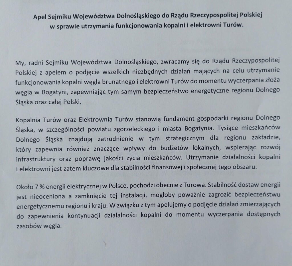 Dziś uczestniczyłem w Sesji Sejmiku Województwa Dolnośląskiego w czasie, której procedowano uchwałę złożoną przez radnych Klubu PiS będącą apelem do Rządu RP o podjęcie natychmiastowych działań w celu udzielenia informacji dotyczących funkcjonowania kopalni i elektrowni Turów do momentu wyczerpania złoża węgla.