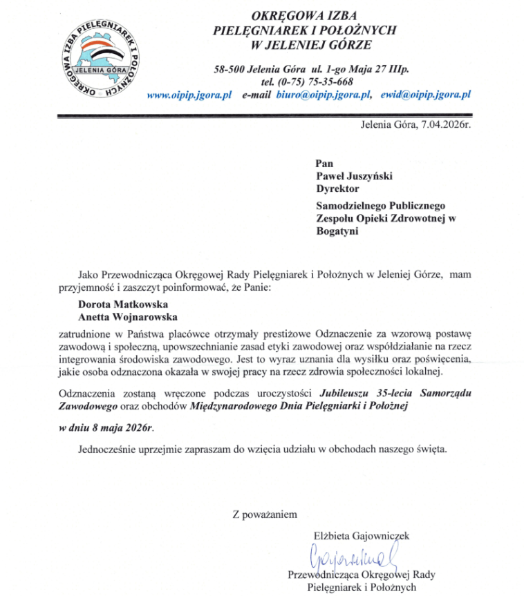 Dwie pielęgniarki z Oddziału Chorób Wewnętrznych szpitala w Bogatyni – Dorota Matkowska i Anetta Wojnarowska otrzymały prestiżowe Odznaczenie za wzorową postawę zawodową i społeczną, upowszechnianie zasad etyki zawodowej oraz współdziałanie na rzecz integrowania środowiska zawodowego od Okręgowej Izby Pielęgniarek i Położnych w Jeleniej Górze.
