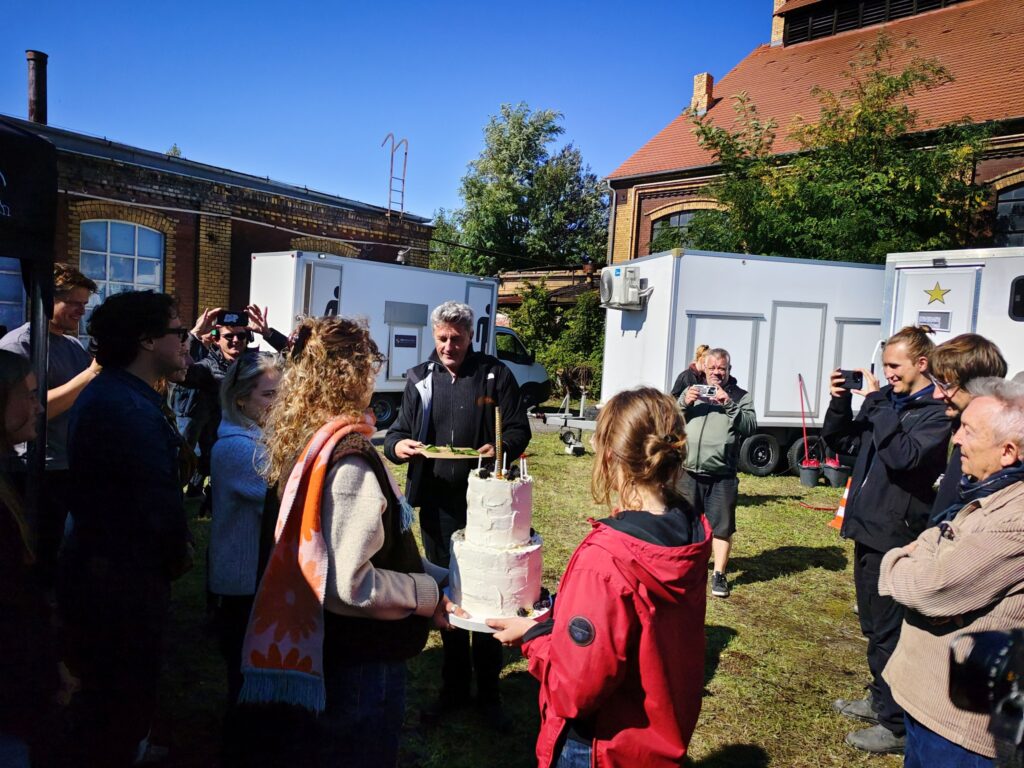 „W ostatnich dniach, nasza Huta Szkła Nysa (Lucyna) na kilka dni zamieniła się w plan filmowy. Swój najnowszy obraz kręcił u nas Paweł Pawlikowski, jak dotąd jedyny polski „oskarowy” reżyser, autor m.in. „Idy” i „Zimnej wojny”. Tak się też złożyło, że na ostatni dzień zdjęciowy – poniedziałek, 15 września, przypadły… urodziny reżysera. Z wielką przyjemnością wraz z radnym Andrzejem Świderskim wpadliśmy więc na plan filmowy z powinszowaniami i urodzinowym tortem od mieszkańców Gminy Pieńsk. Życzyliśmy Pawłowi Pawlikowskiemu dalszych sukcesów artystycznych i… kolejnego Oskara. Mimo, że jak zasugerował: są one nieco przereklamowane, życzeń nie zmieniamy, bo kiedy się spełnią… nasz Pieńsk i nasza huta będą też miały w tym swój udział.