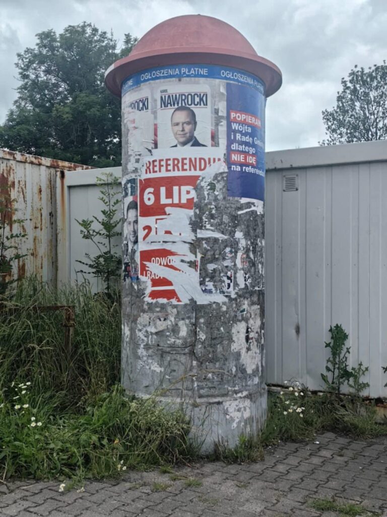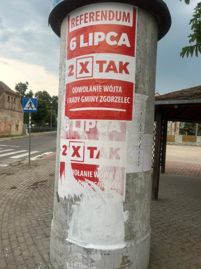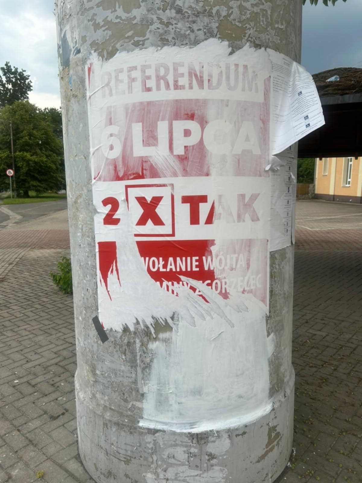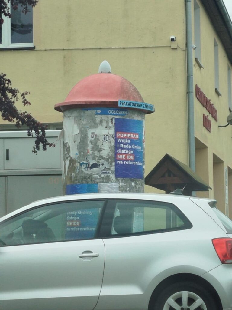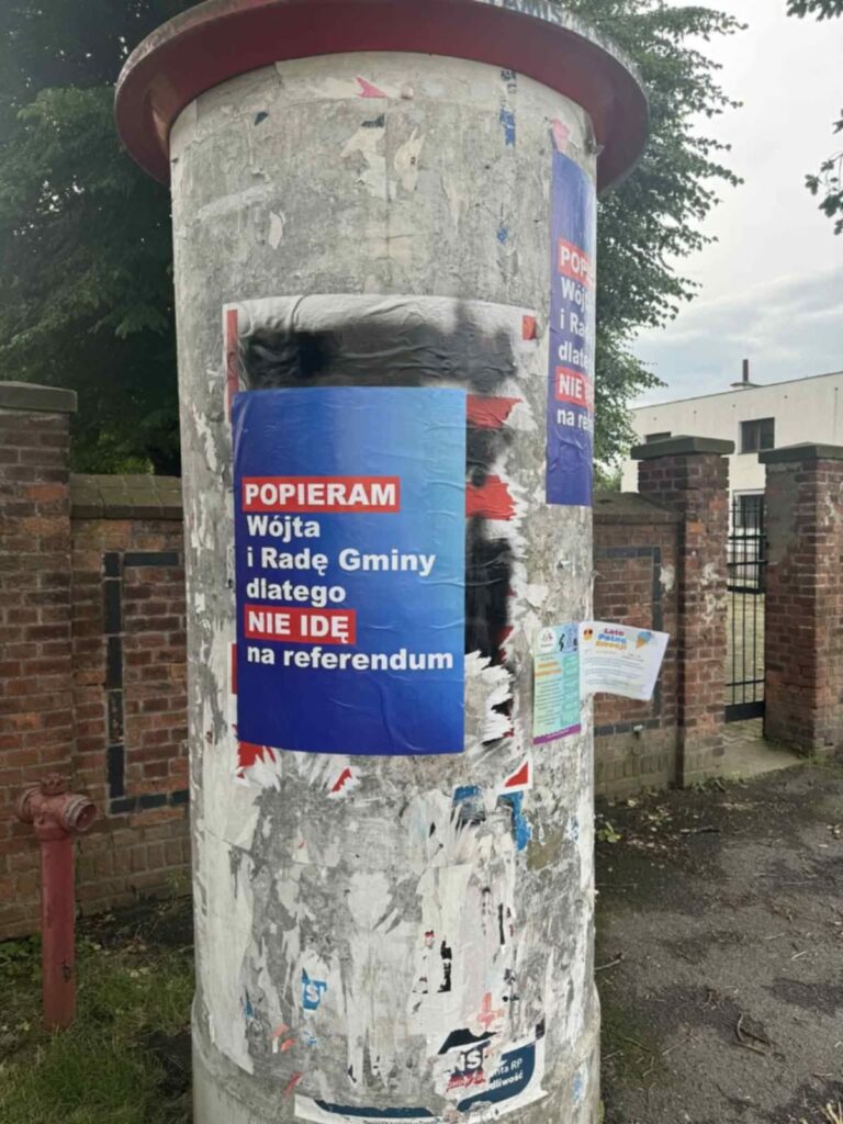 Obecnie, na polecenie Gminnego Ośrodka Kultury i Sportu, w całej gminie zrywane i niszczone są plakaty informujące o referendum. Zamiast tego pojawiają się plakaty z hasłem: „Popieram Wójta i Radę Gminy, dlatego nie idę na referendum”. Taki obraz sytuacji budzi poważne zaniepokojenie – plakaty referendalne, które są oficjalnym materiałem wyborczym, zgodnie z obowiązującymi przepisami, podlegają ochronie prawnej. Oznacza to, że nie można ich samowolnie niszczyć ani usuwać. Wczoraj o tej sprawie poinformowano policję, licząc na podjęcie odpowiednich działań.