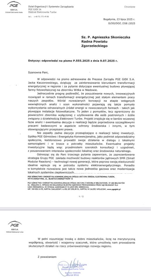 PGE Górnictwo i Energetyka Konwencjonalna S.A. odpowiedziała na zapytanie radnej Agnieszki Skonieczki dotyczące budowy pływającej farmy fotowoltaicznej na zbiorniku Witka. Spółka potwierdziła, że analizuje różne możliwości rozwoju OZE, jednak w sprawie zbiornika Witka nie zapadły jeszcze żadne decyzje. Ewentualne inwestycje mają jednak być poprzedzone analizami oraz konsultacjami z lokalną społecznością i władzami.