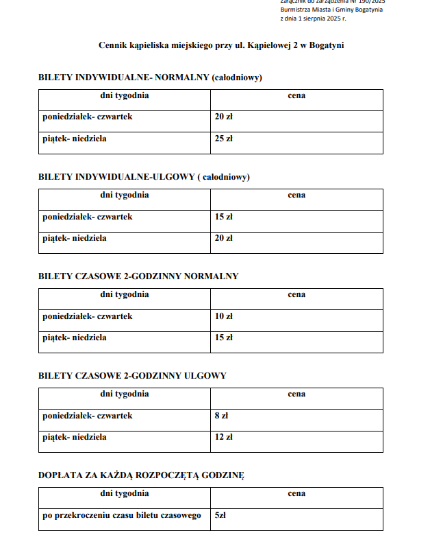Zarządzenie Nr 190/2025 Burmistrza Miasta i Gminy Bogatynia z dnia 1 sierpnia 2025 r. w sprawie wprowadzenia cennika biletów obowiązujących na kąpielisku miejskim przy ul. Kąpielowej 2 w Bogatyni.