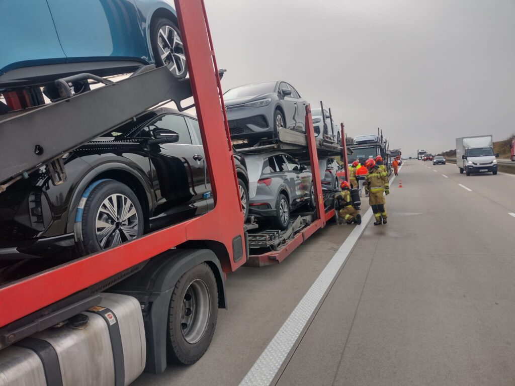 KP PSP Zgorzelec: W dniu 14.11.2025 r. na autostradzie A4 (10 km w kierunku Bolesławca) doszło do zapalenia hamulców w samochodzie ciężarowym transportującym auta elektryczne.