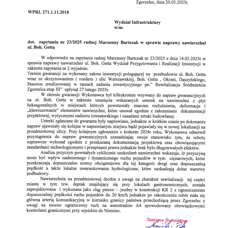 Co ciekawe w tej sprawie – 14 marca b.r. radna Marzena Bartczak złożyła zapytanie do Burmistrza Miasta Zgorzelec o naprawę nawierzchni ul. Bohaterów Getta, kiedy nastąpi i czy w ramach gwarancji. W odpowiedzi na zapytanie radnej czytamy, że jeszcze w czasie trwania gwarancji, wykonawca odmówił przystąpienia do napraw gwarancyjnych, co najwyraźniej magistrat przyjął bez żadnego problemu. Gwarancja zgodnie z obowiązującą umową skończyła się dopiero 27 lutego 2025 r. Z odpowiedzi wynika, że wykonawca uznał kolejną naprawę za bezsensowną, a miasto zwyczajnie przyjęło to do wiadomości, bez żadnego „ale”?!