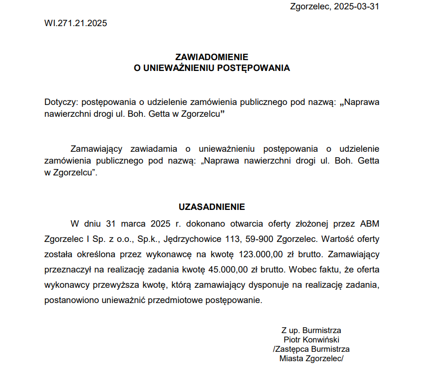 W zeszłym tygodniu miasto ogłosiło przetarg na Naprawę nawierzchni drogi ul. Boh. Getta w Zgorzelcu, pisaliśmy o tym TUTAJ. Wczoraj minął termin składania ofert i pojawiła się informacja z ich otwarcia. Jak się okazuje, wpłynęła tylko jedna, od firmy ABM Zgorzelec I i znacznie przewyższyła budżet założony przez Miasto Zgorzelec, w związku z tym przetarg unieważniono:
