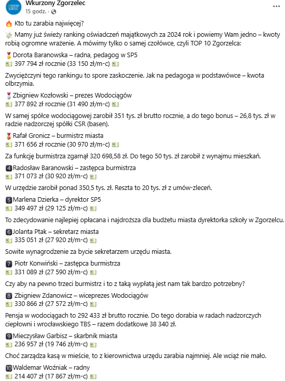 Niedawno w Biuletynie Informacji Publicznej Urzędu Miasta Zgorzelec pojawiły się oświadczenia majątkowe radnych za rok 2024. Największe kontrowersje wzbudziła informacja o zarobkach radnej Doroty Baranowskiej, żony wiceburmistrza, która jako pedagog w publicznej szkole podstawowej zarobiła 397 794 zł, czyli około 33 tysiące złotych brutto miesięcznie. To kwota nieosiągalna dla większości mieszkańców Zgorzelca. Podkreślamy — pedagog, w publicznej szkole podstawowej. Dla porównania — Szkoła Podstawowa nr 3 w Zgorzelcu zatrudnia dwóch pedagogów, którzy łącznie w 2024 r. zarobili: 282 319,36 zł!