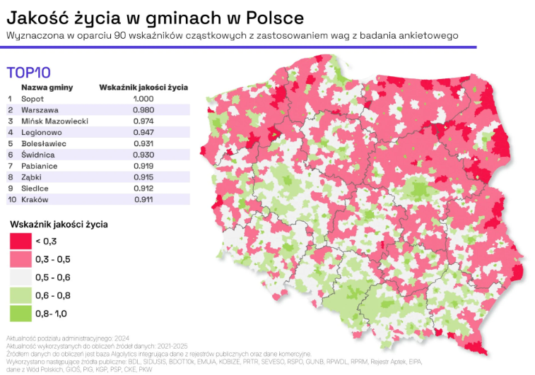 Powstał raport, przygotowany przez firmę Algolitycs we współpracy z Agencją Badawczą SW Research, zawierający kilkaset stron kompleksowej analizy jakości życia w każdej gminie w Polsce. Raport „Gdzie żyje się najlepiej?” zestawia 90 wskaźników opisujących każdą lokalizację – od zdrowia, przez edukację, transport, dostępność usług, aż po warunki ekonomiczne i środowisko. Każdy wskaźnik ma przypisaną wagę, a ranking prezentuje dwie perspektywy: ekspercką oraz ankietową, bazującą na wynikach reprezentatywnego badania opinii dorosłych Polaków.