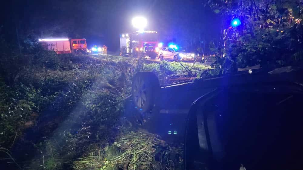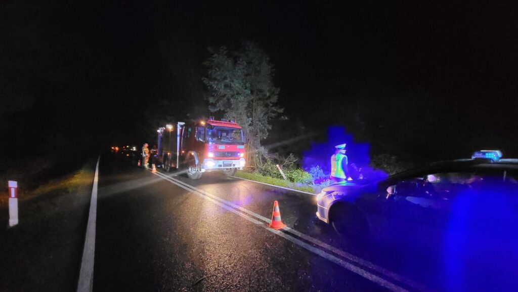 Samochód osobowy, z nieustalonych jeszcze przyczyn zjechał z jezdni, ściął przydrożne drzewa, a następnie dachował. W wyniku zdarzenia śmierć na miejscu poniosła jedna osoba dorosła. Podróżująca z nią osoba małoletnia została ranna i trafiła pod opiekę służb medycznych.
