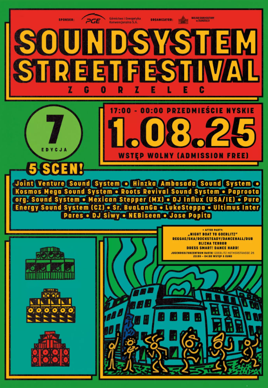 Piątek, 1 sierpnia 2025, godzina 17:00 – tego popołudnia nie warto zostawać w domu. Na Przedmieściu Nyskim w Zgorzelcu startuje siódma edycja Soundsystem Street Festival – pięć niezależnych scen, artyści z Polski i zagranicy, pozytywne wibracje i dobra energia, a wszystko w duchu „One World, One People”. Wszystko to pod gołym niebem – bez barier, bez biletów, z pełnym szacunkiem dla ulicy i jej potencjału.