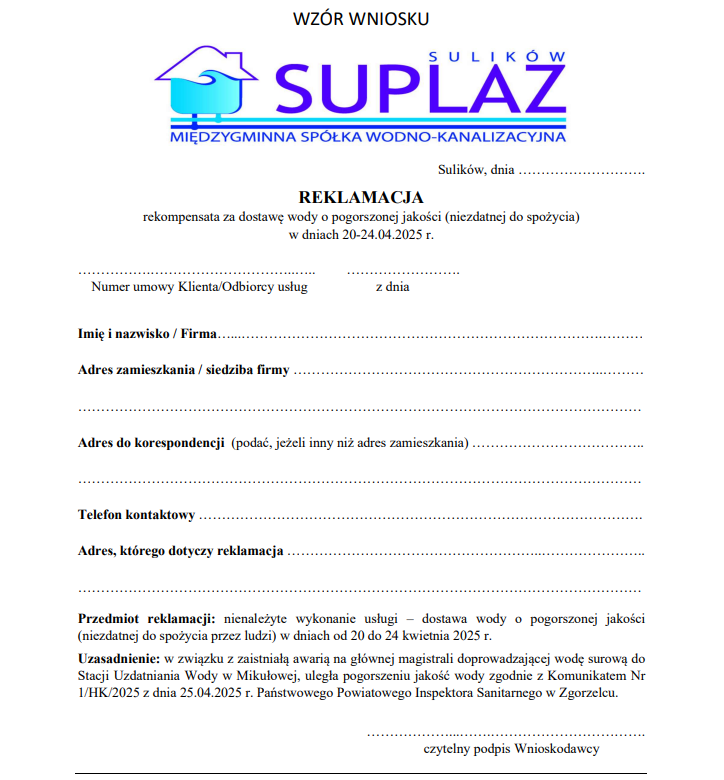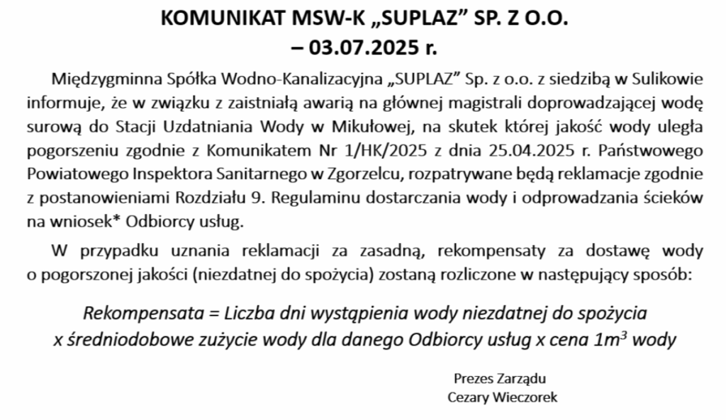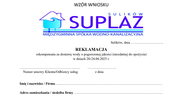 Tagi: Rekompensata dla mieszkańcówrekompensata za brak wodyrekompensata za dostawę wody o pogorszonej jakościsulikówsuplaz