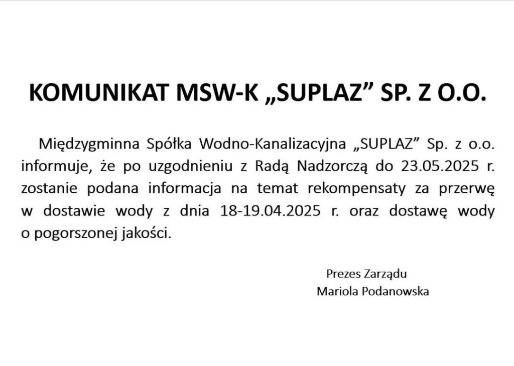 Dziś międzygmina spółka wodno-kanalizacyjna Suplaz podała do wiadomości informację o planowanej rekompensacie za przerwę w dostawie wody oraz wodę o pogorszonej jakości. Do 23 maja mamy poznać szczegóły. Pod artykułem pełna treść komunikatu.