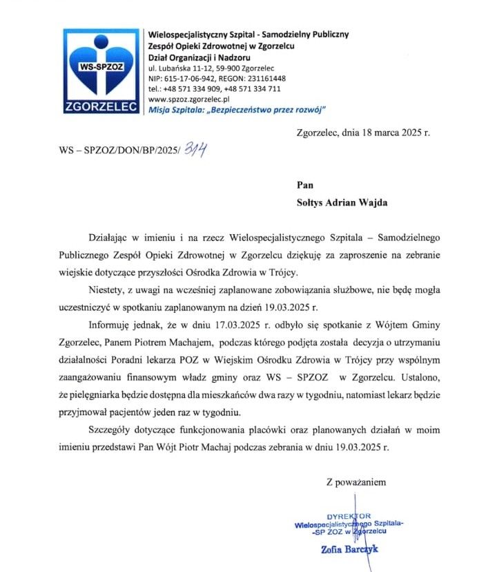 Nie wiemy, co dokładnie oznacza „wspólne zaangażowanie finansowe” i ile będzie to kosztowało gminę Zgorzelec. Decyzja na pewno bardzo cieszy mieszkańców Trójcy, zwłaszcza tych, którzy mają problem z dojazdem do lekarzy spoza miejscowości.