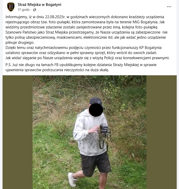 Policjanci z Referatu Kryminalnego Komisariatu Policji w Bogatyni zatrzymali 26-latka podejrzanego o kradzież fotopułapki wraz z akcesoriami. Do przestępstwa doszło dwa dni wcześniej na terenie gminy Bogatynia. Jak ustali funkcjonariusze, sprawca skradł urządzenie monitorujące o wartości ponad 1,6 tysiąca złotych. Nie przewidział jednak, że w pobliżu znajdowała się druga fotopułapka, która zarejestrowała zdarzenie.