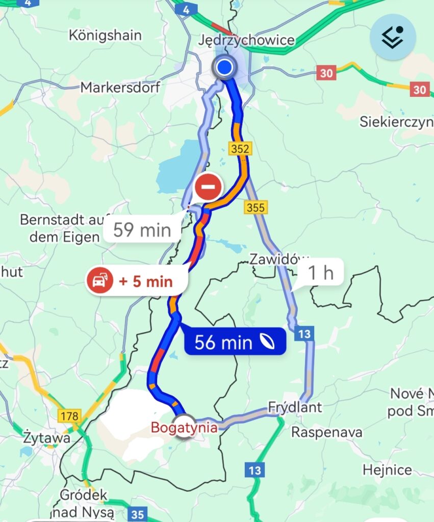 Mapy wskazują objazd przez czeski Frydlant.