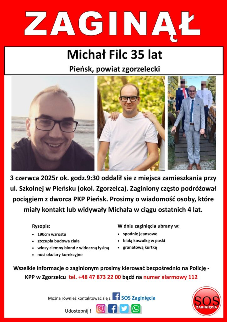 35-letni Michał Filc, mieszkaniec Pieńska zaginął we wtorek 3 czerwca. Około godziny 9:30, wyszedł ze swojego domu mieszczącego się przy ul. Szkolnej i do chwili obecnej nie wrócił. Mężczyzna kierował się ulicą Hutniczą w stronę PKP Pieńsk. Ostatnie logowanie telefonu miało miejsce w okolicy starej gazowni w Pieńsku około godziny 22 w dniu zaginięcia. Miał przy sobie dokumenty oraz telefon, który jest już nieaktywny.