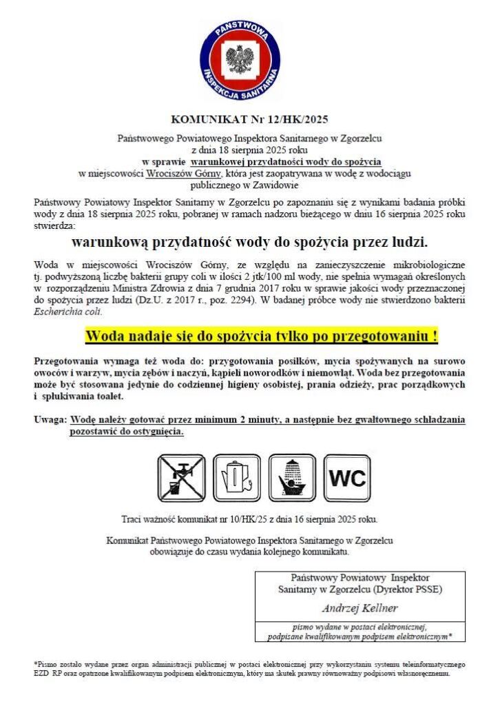 Najnowszy komunikat sanepidu w sprawie przydatności do spożycia wody w miejscowości Wrociszów Górny: