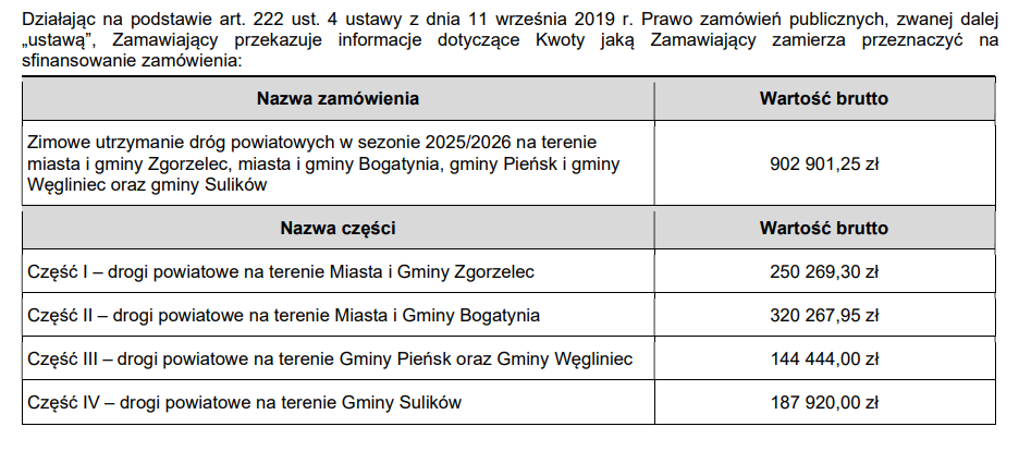Dziś zakończyło się postępowanie: Zimowe utrzymanie dróg powiatowych w sezonie 2025/2026 na terenie miasta i gminy Zgorzelec, miasta i gminy Bogatynia, gminy Pieńsk i gminy Węgliniec oraz gminy Sulików. Nie wiedzieć dlaczego, powiat bardzo późno wziął się do pracy i przetarg ogłosił dopiero w drugiej połowie listopada. Czyżby nikt tam nie przewidział, że opady śniegu pod koniec jesieni to w Polsce częste zjawisko – taki mamy klimat?